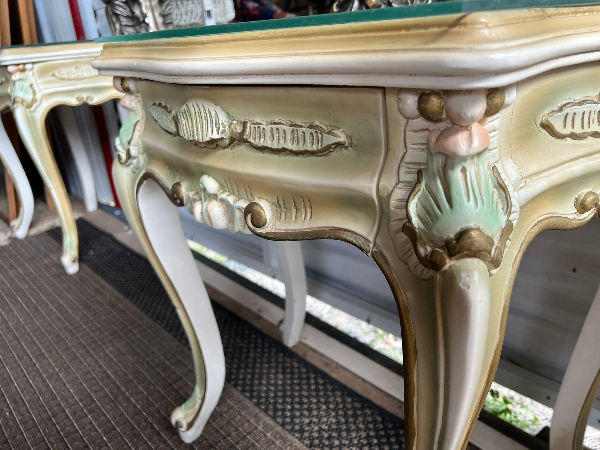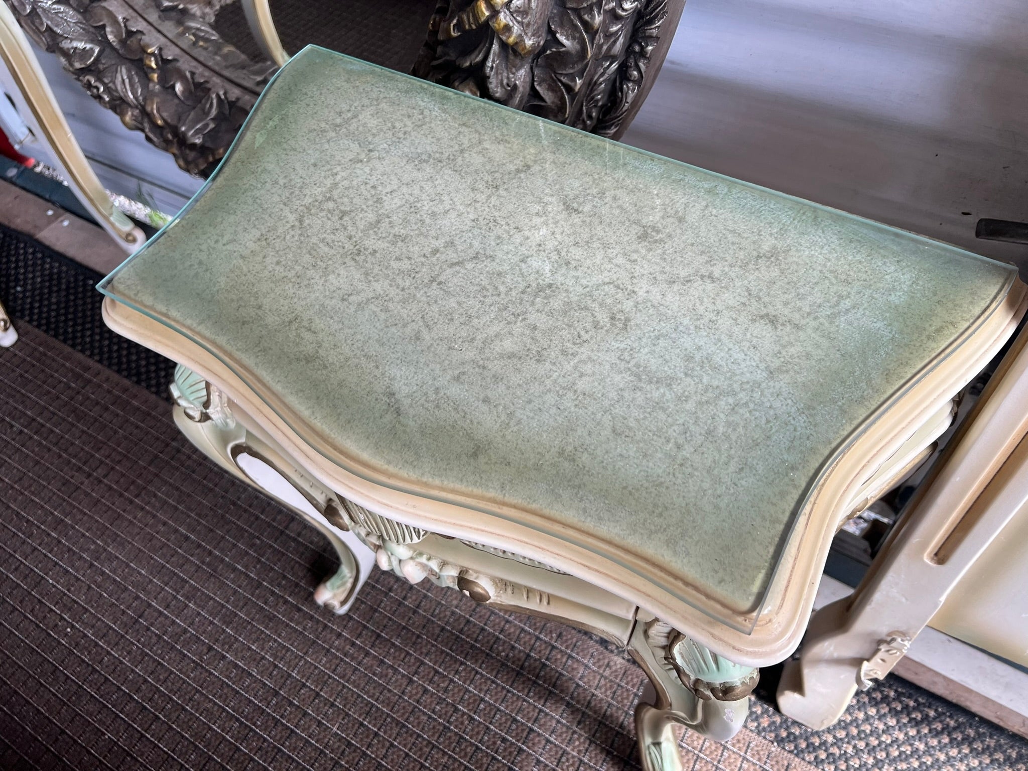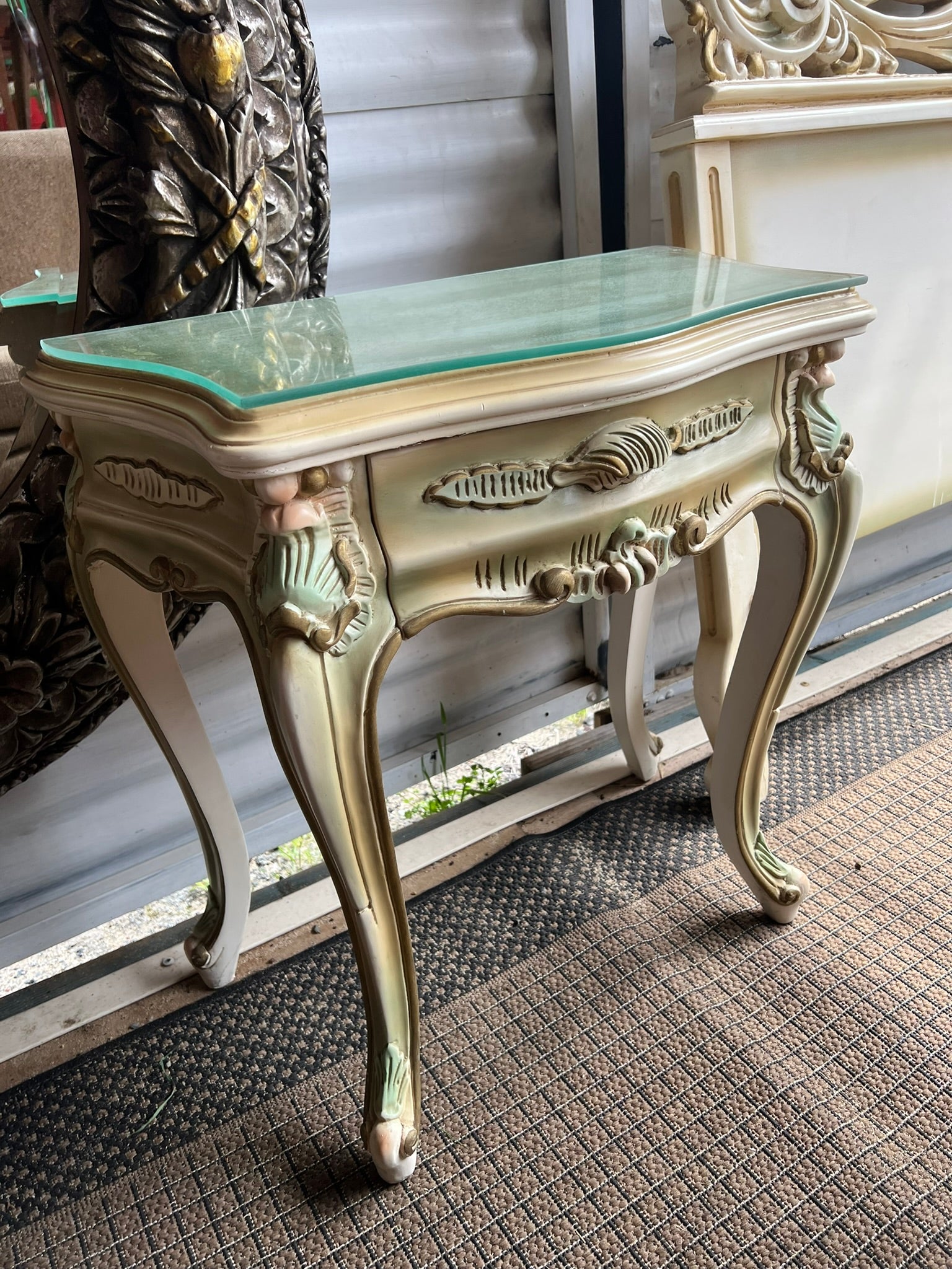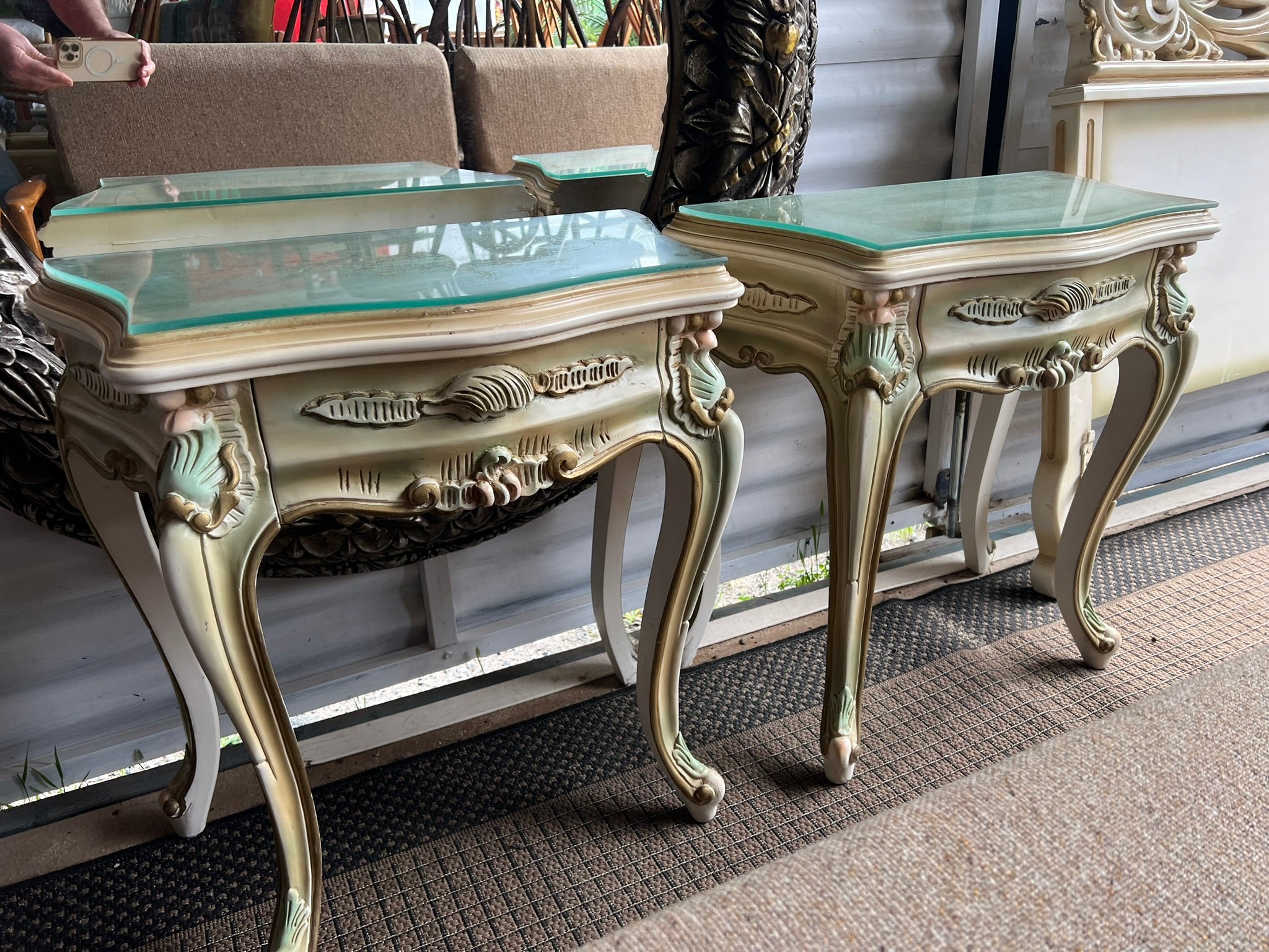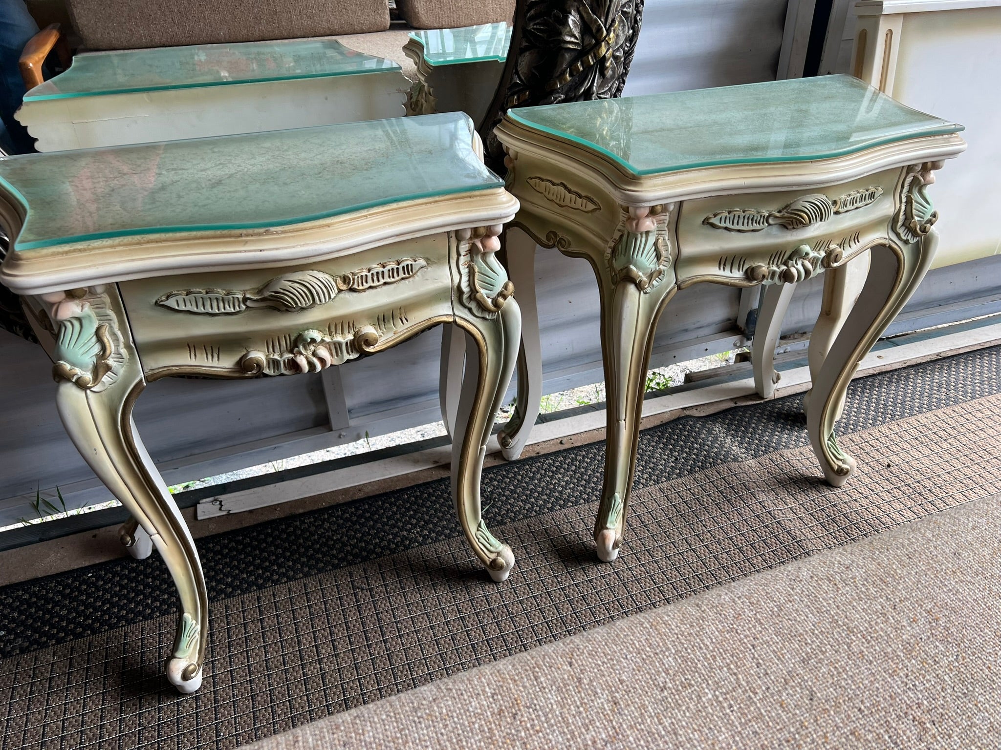 Description: A pair of Venetian stye vintage bedsides tables with one drawer. Carved and painted wood made in Italy. Beveled removable glass top.The Pair $790
