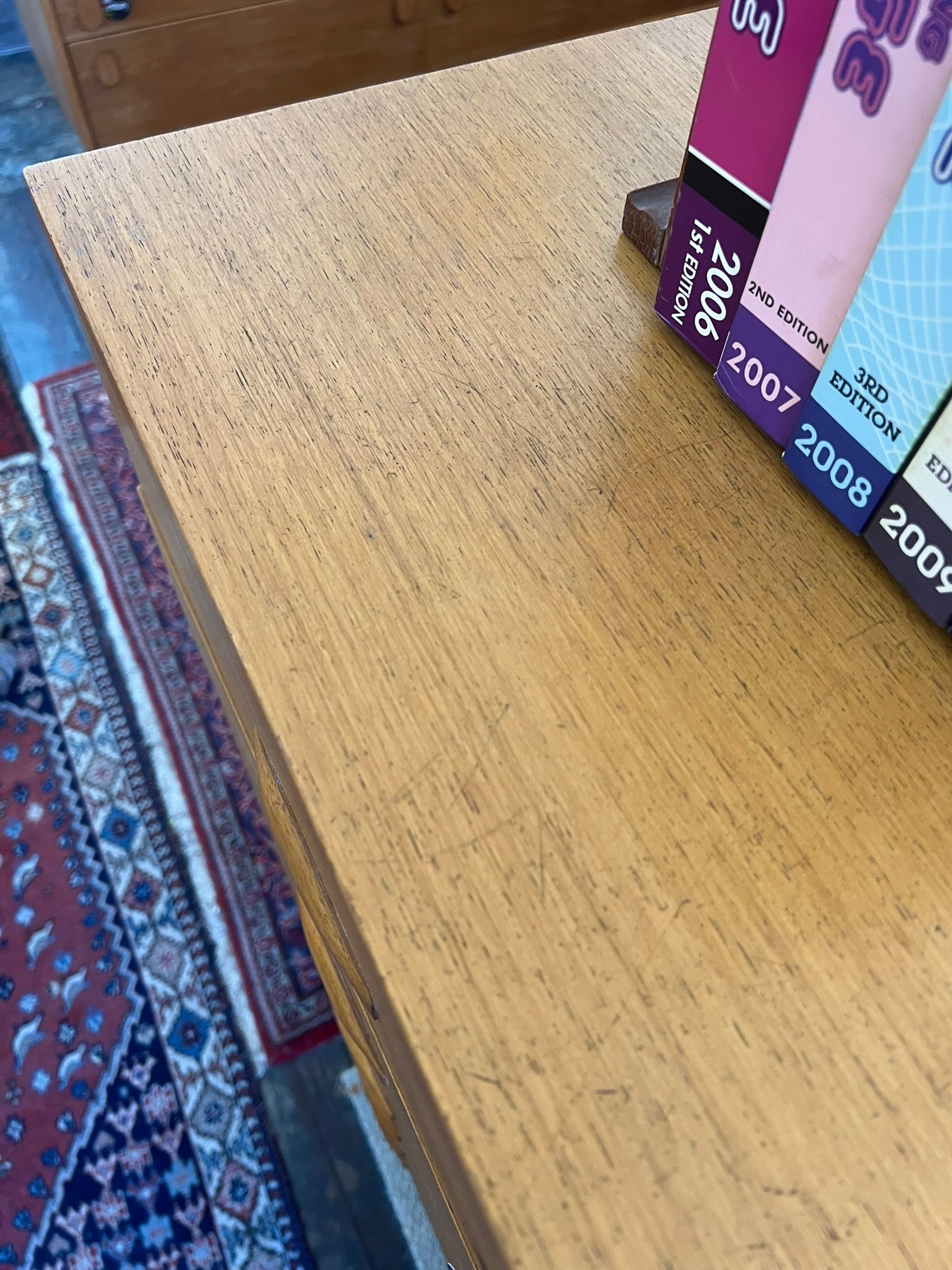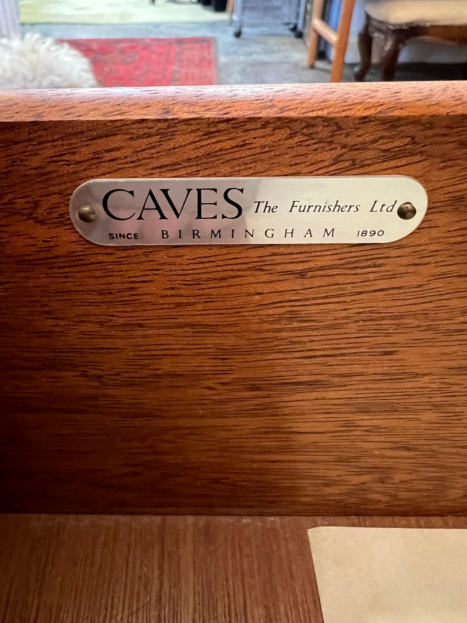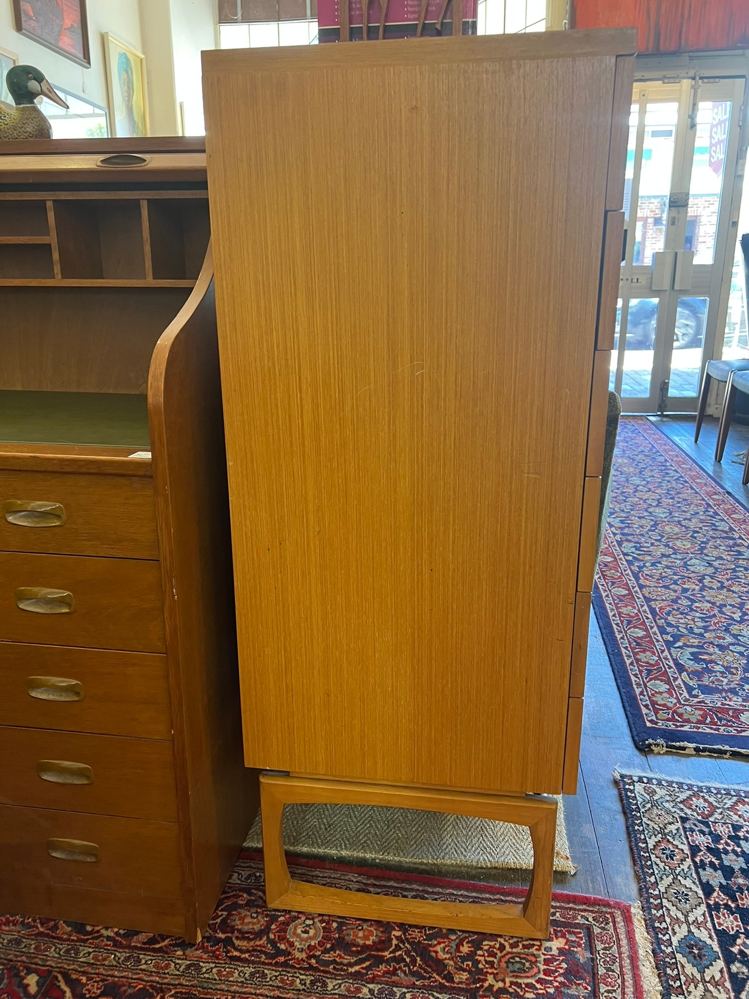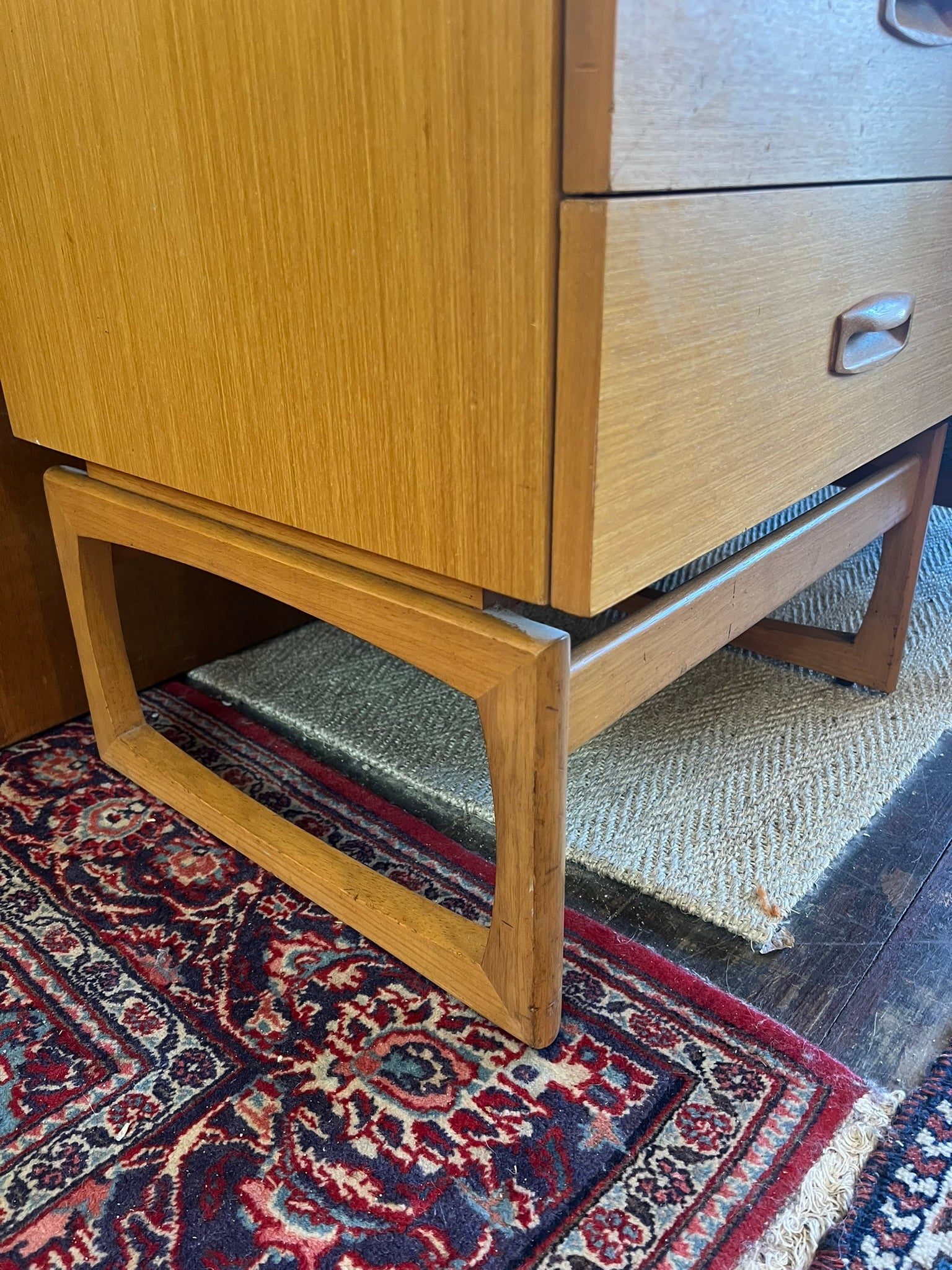 Description: Early 1970s, Caves of Birmingham English made tallboy in teak with 6 drawers on a sleigh legs.