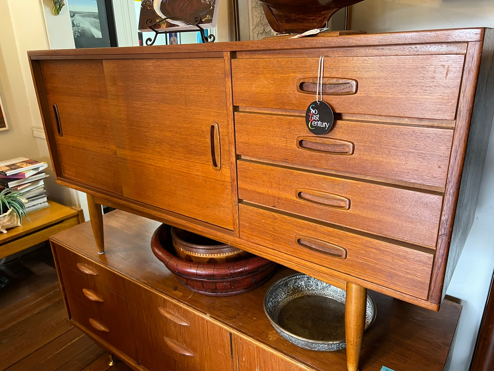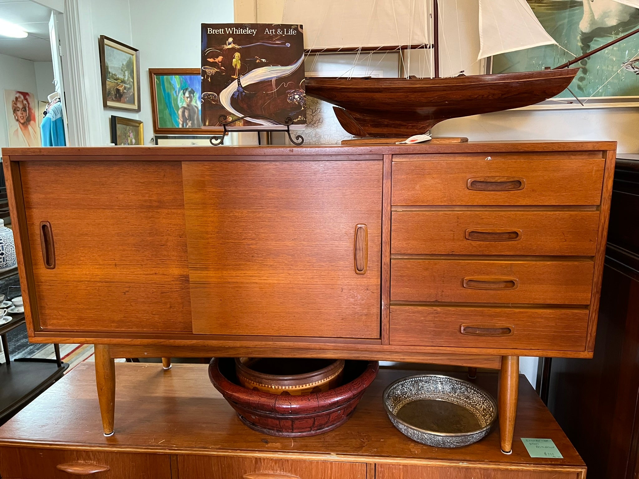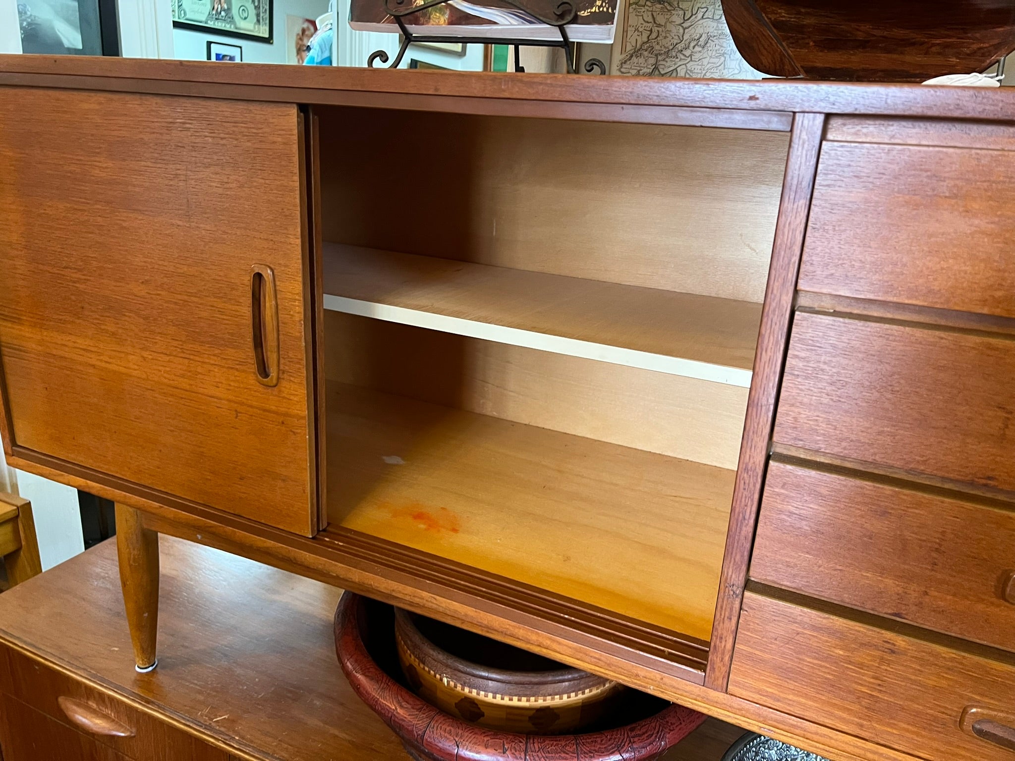 Description: 1960s, Australian made Chatley teak sideboard on cigar legs. Has two doors and three drawers.