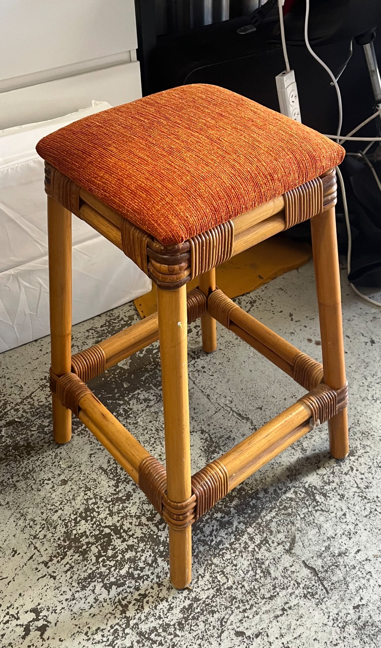 Description: 1960s, Australian made cane bar stools with newly reupholstered orange high quality Warwick fabric - set of 4 available.