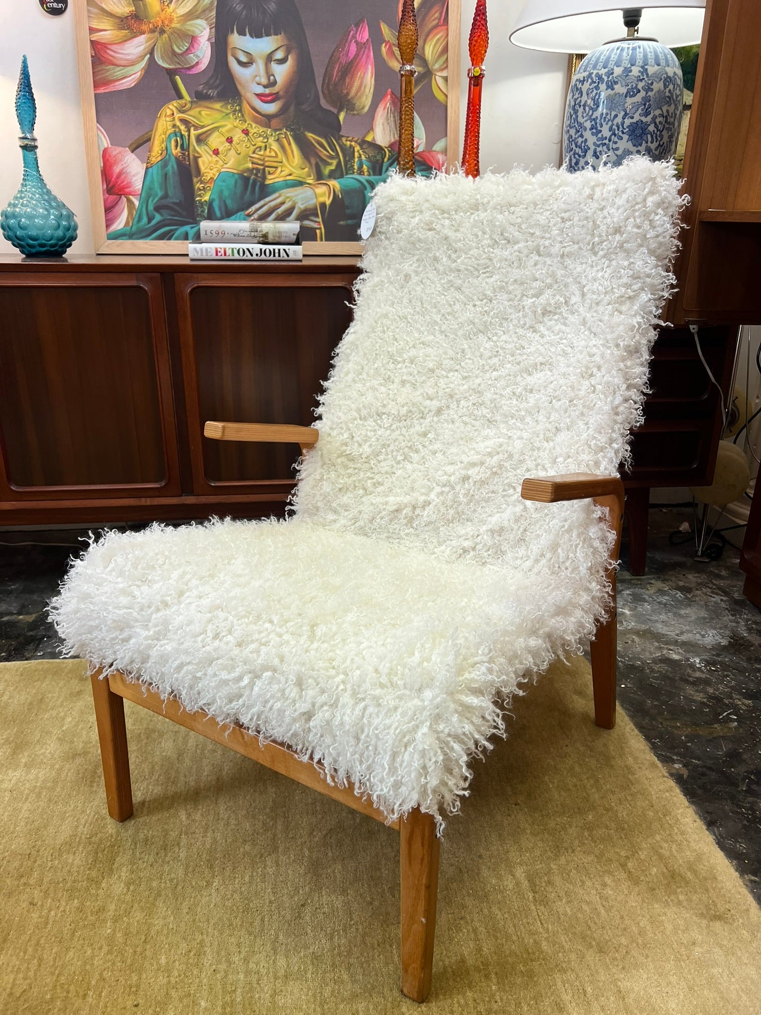 Niels Eilersen Danish high back chair covered in faux Mongolian Sheepskin.