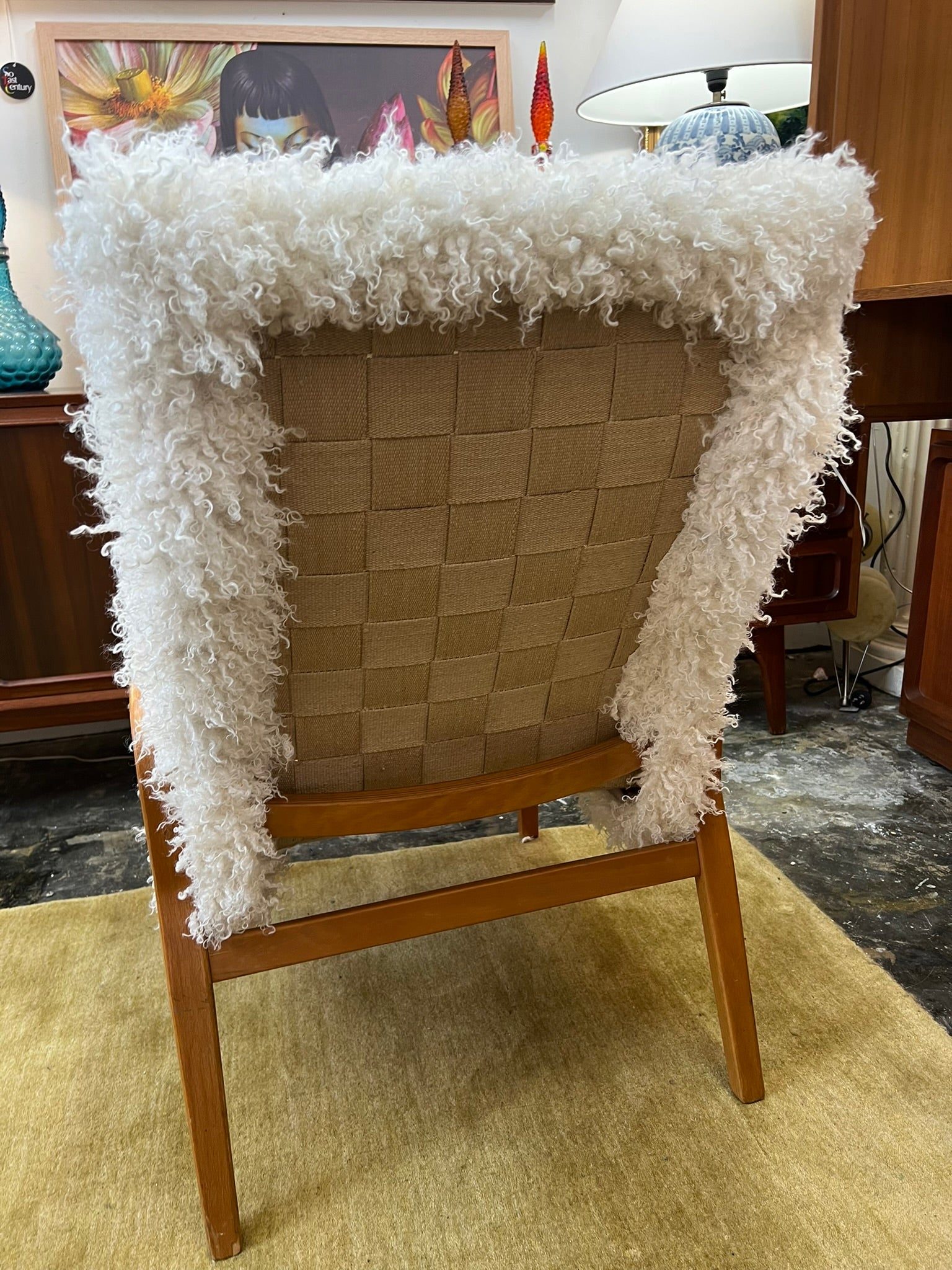 Description: Niels Eilersen Danish high back chair covered in faux Mongolian Sheepskin, featuring a beech frame with seat and back woven webbing strapping.